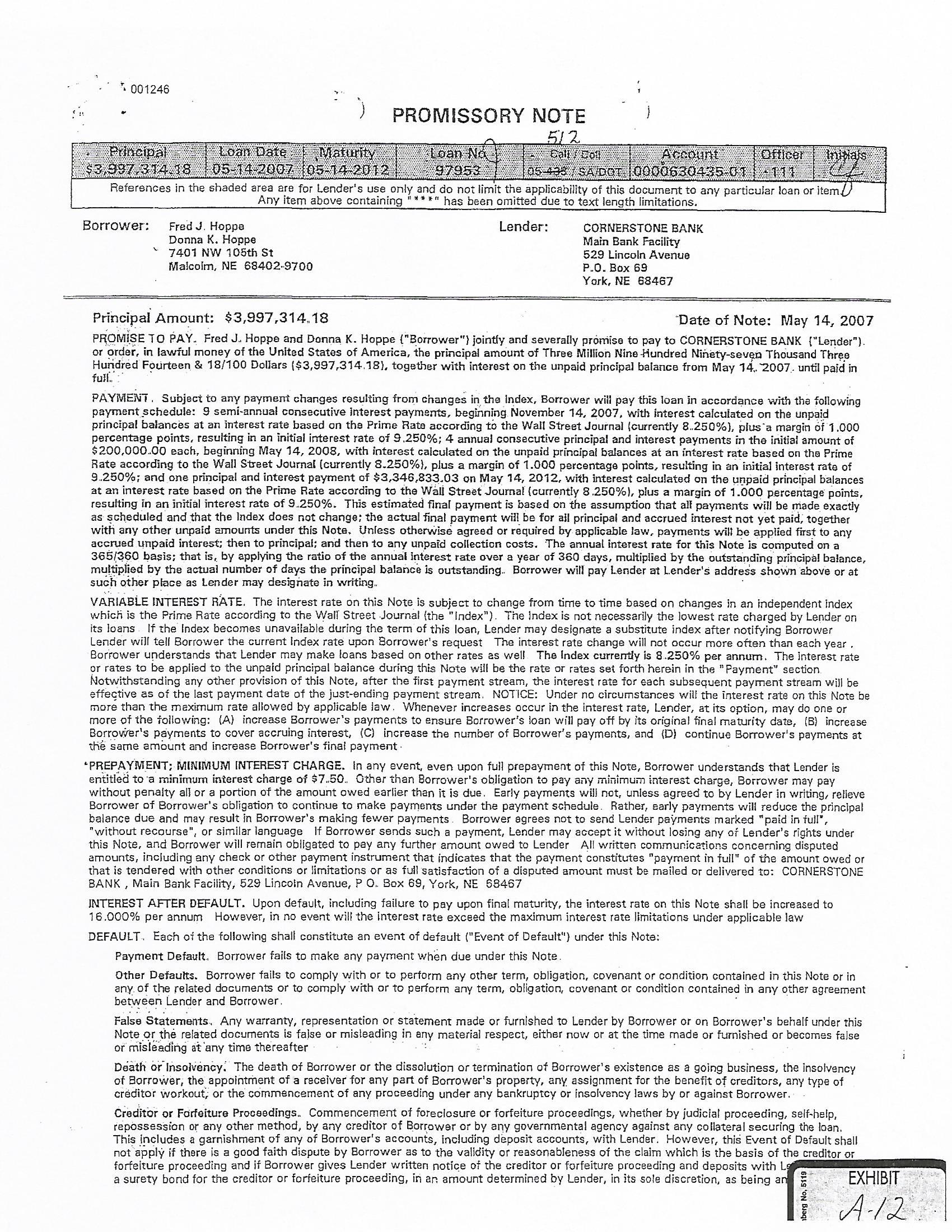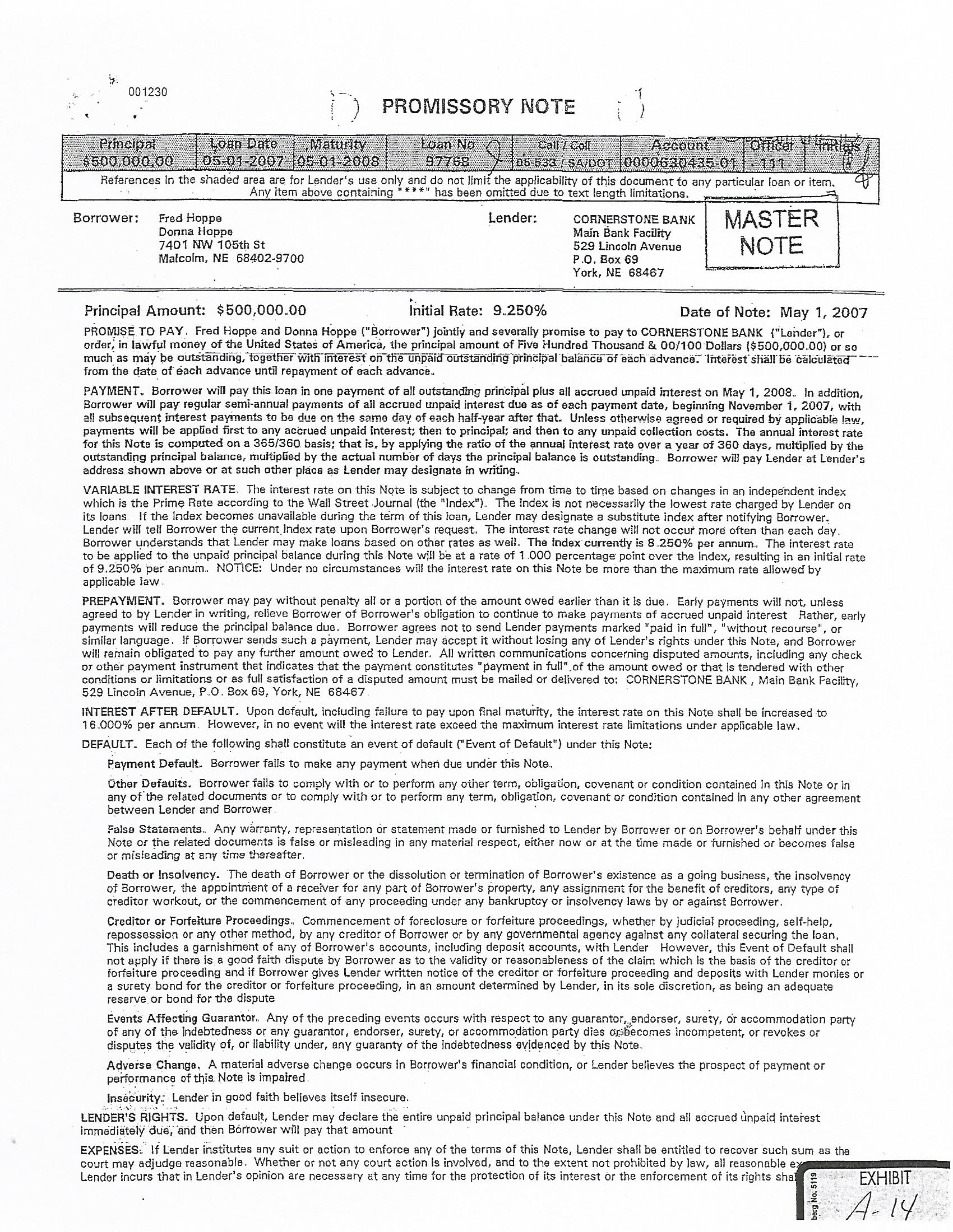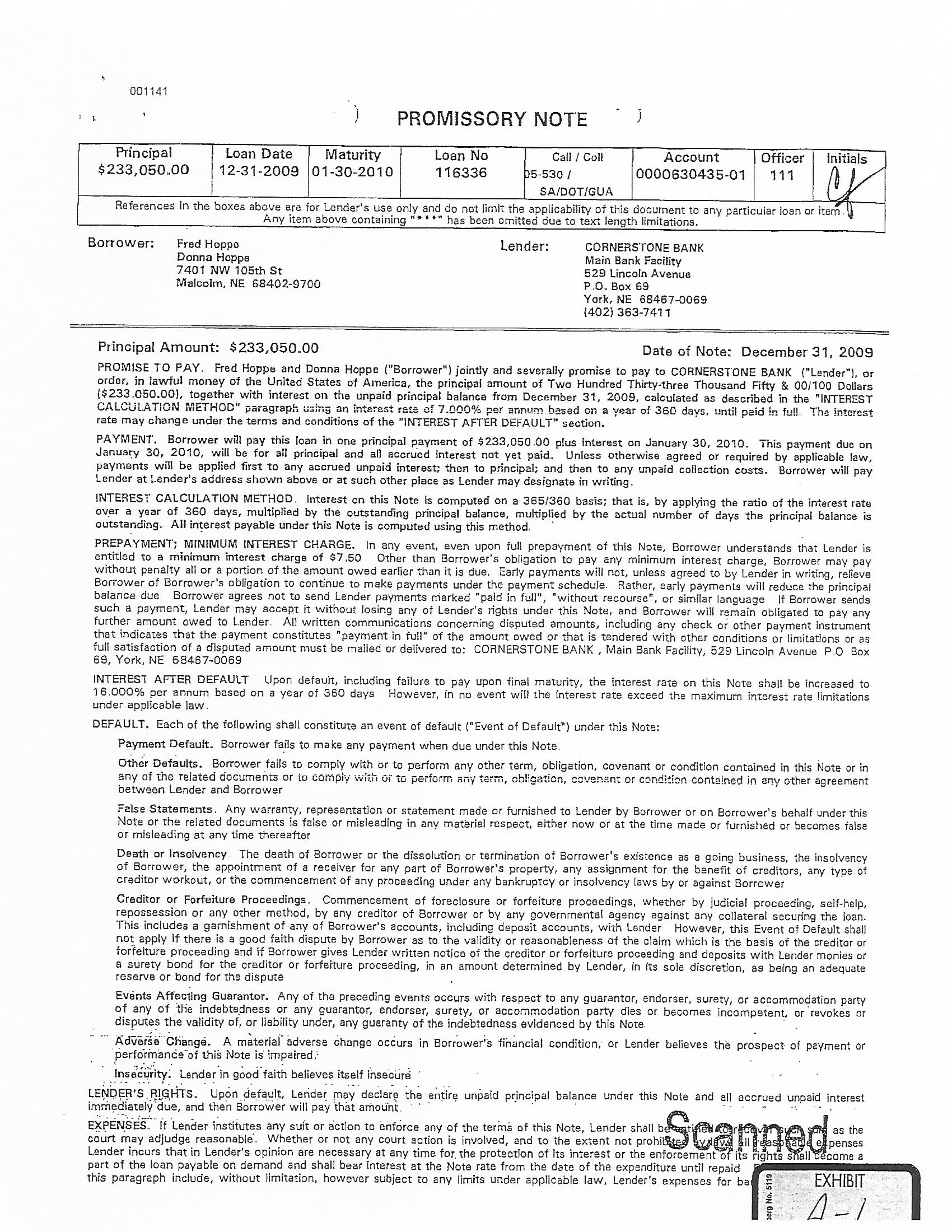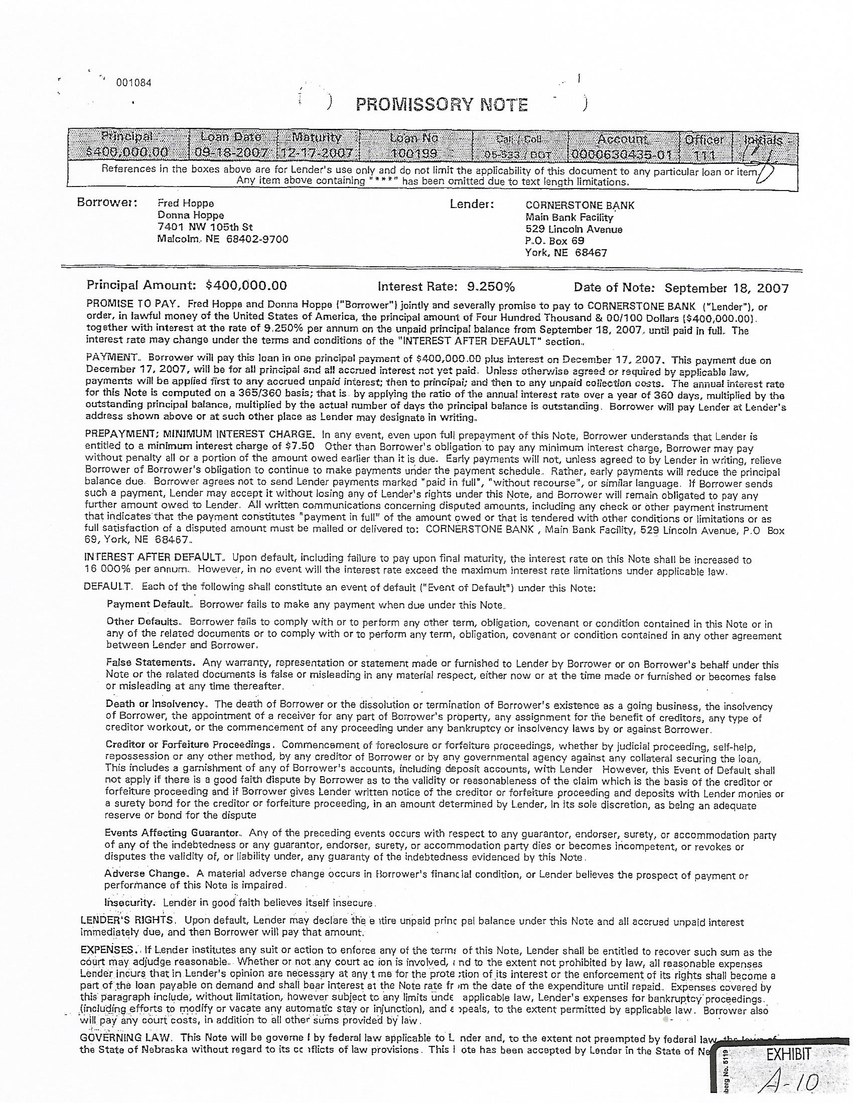The promissory notes demonstrate Cornerstone’s loans to Hoppe over a period of several years. They were entered in as exhibits in the case.