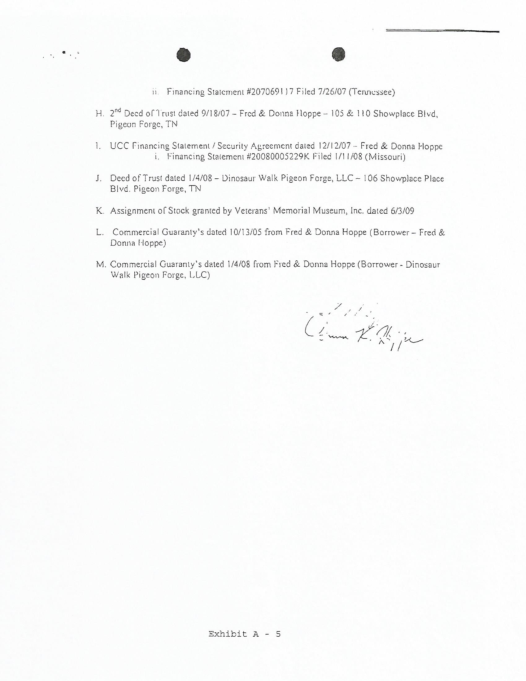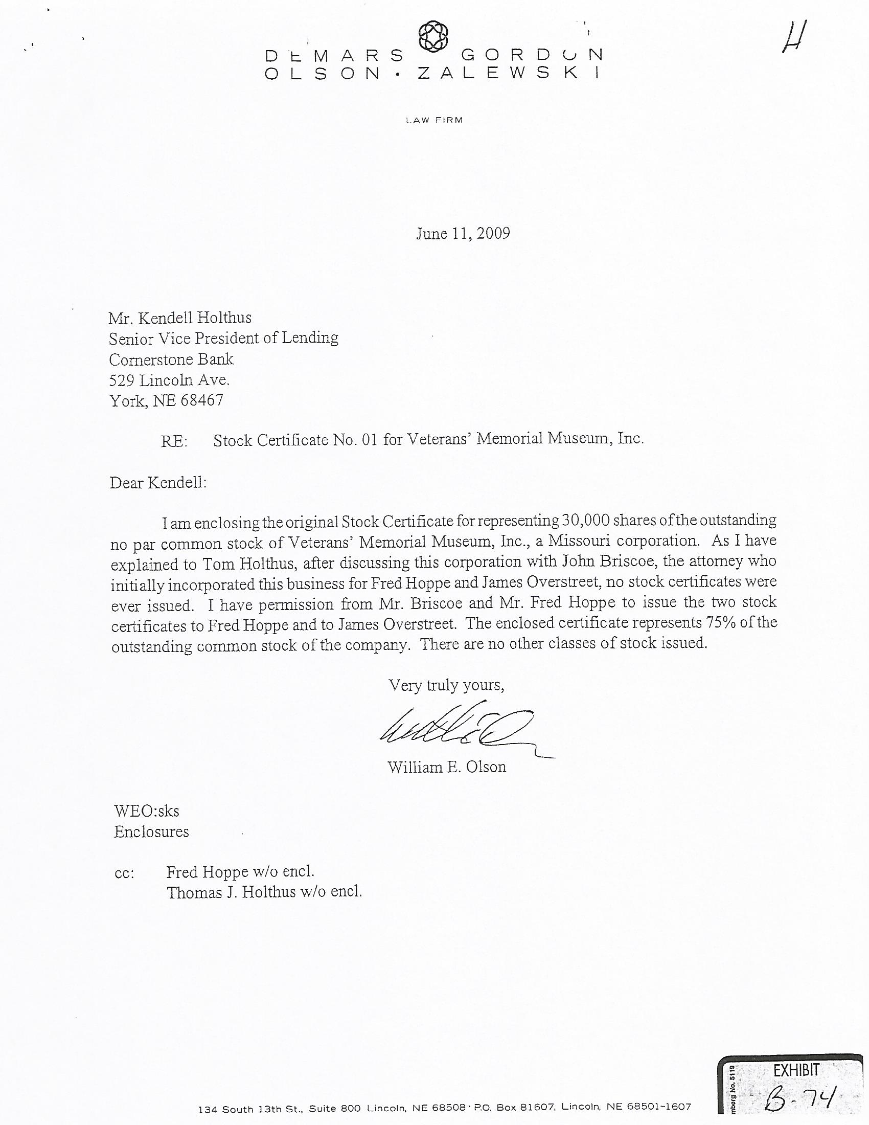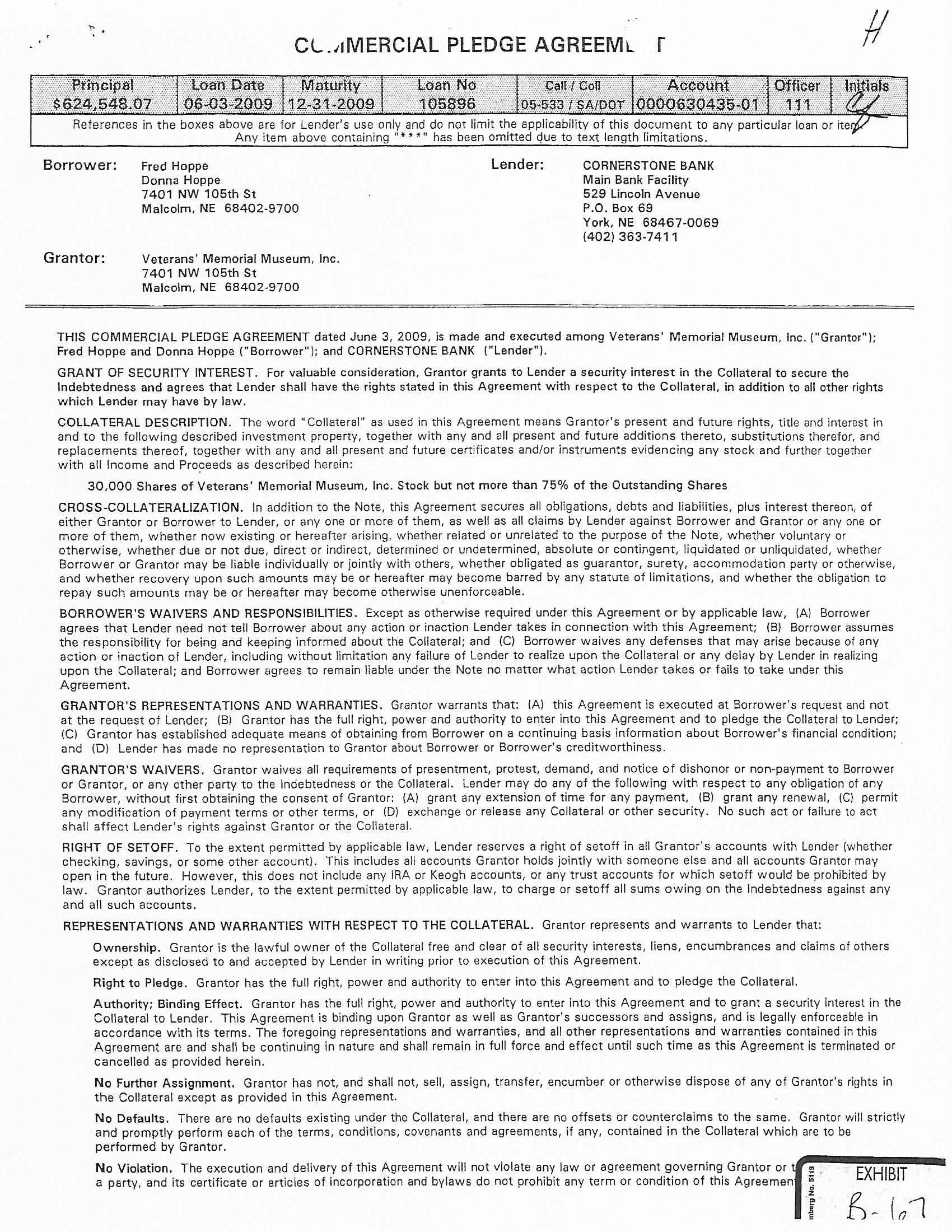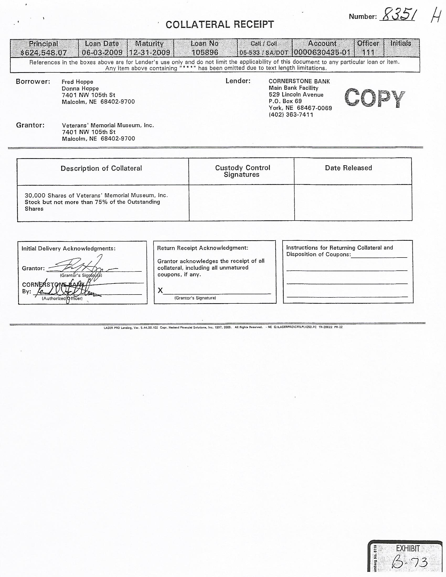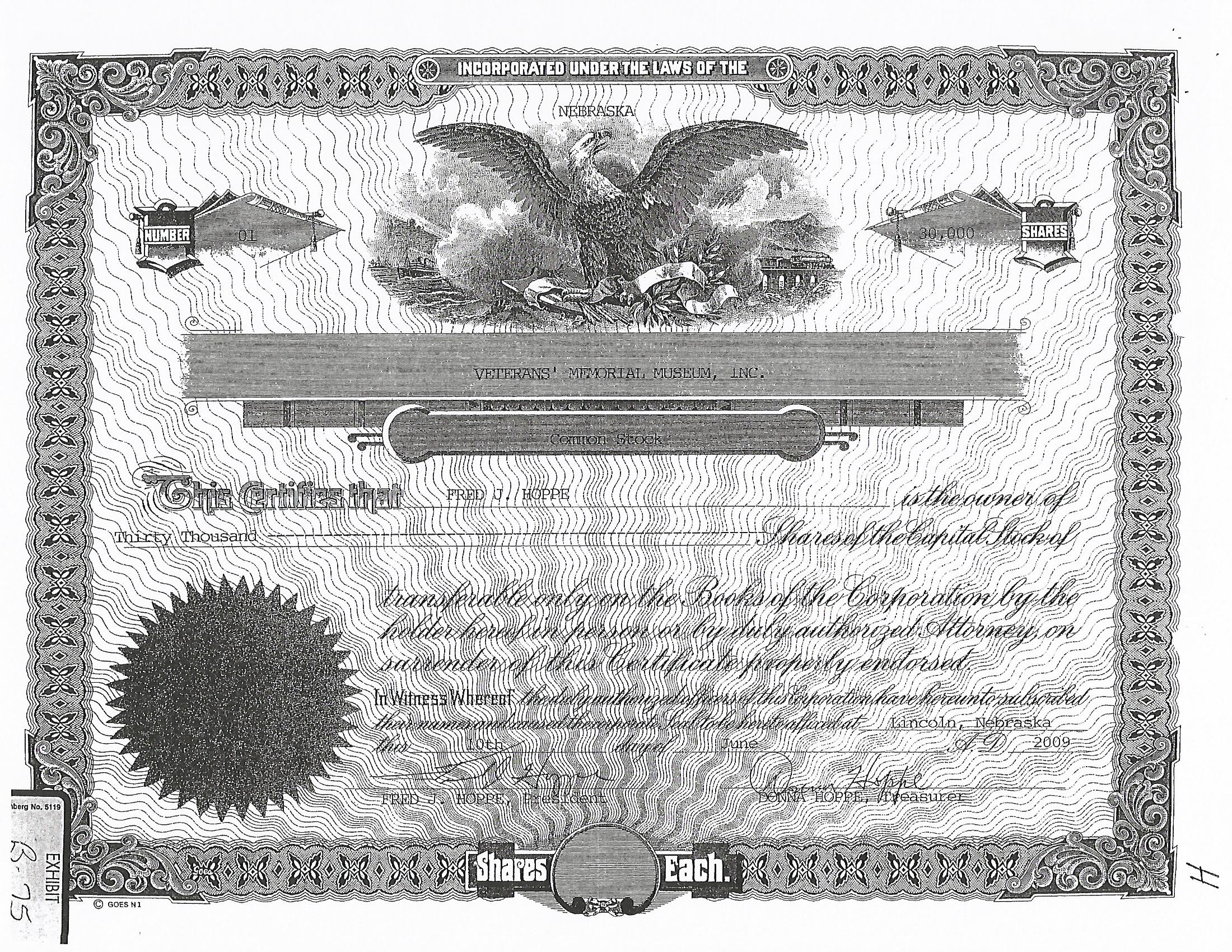 The certificates below were issued, and used for collateral to the bank. The stock certificate for the Veterans Memorial Museum was issued on 10th of June 2009. One week after the loan of June 3rd 2009 was issued using the shares of stock as collateral.