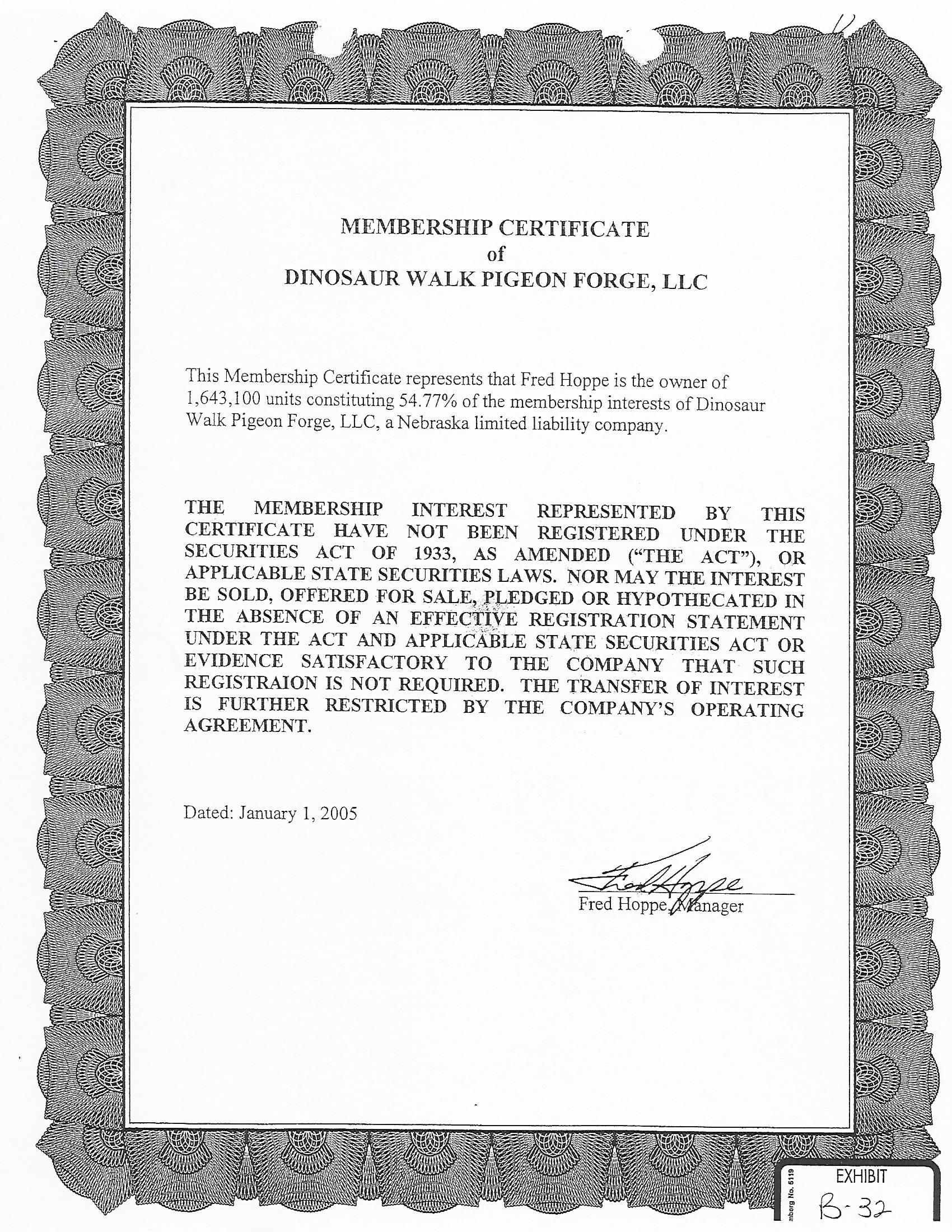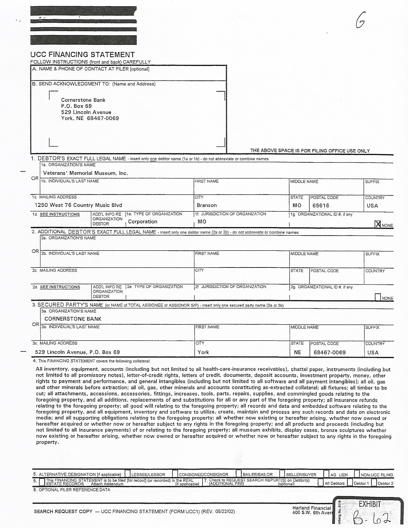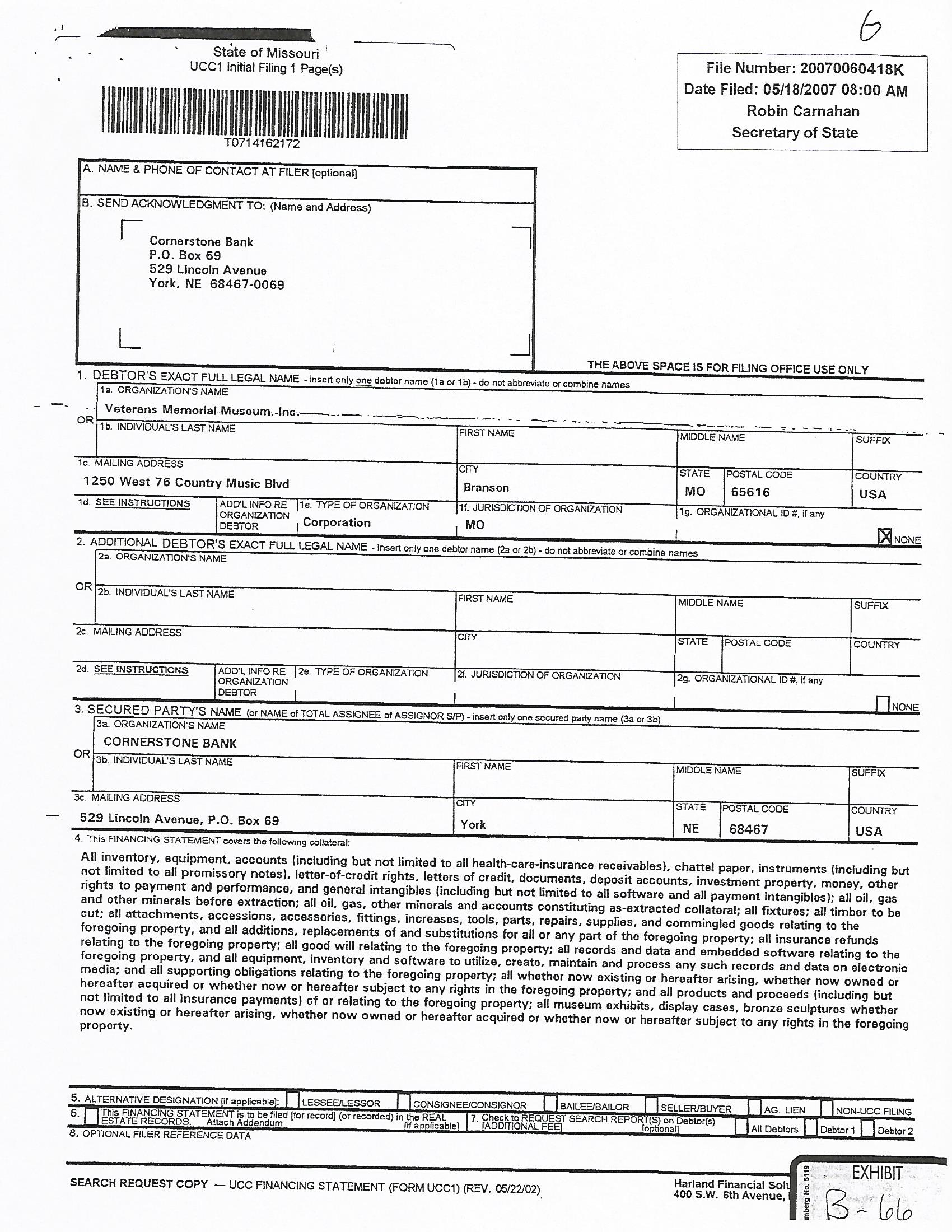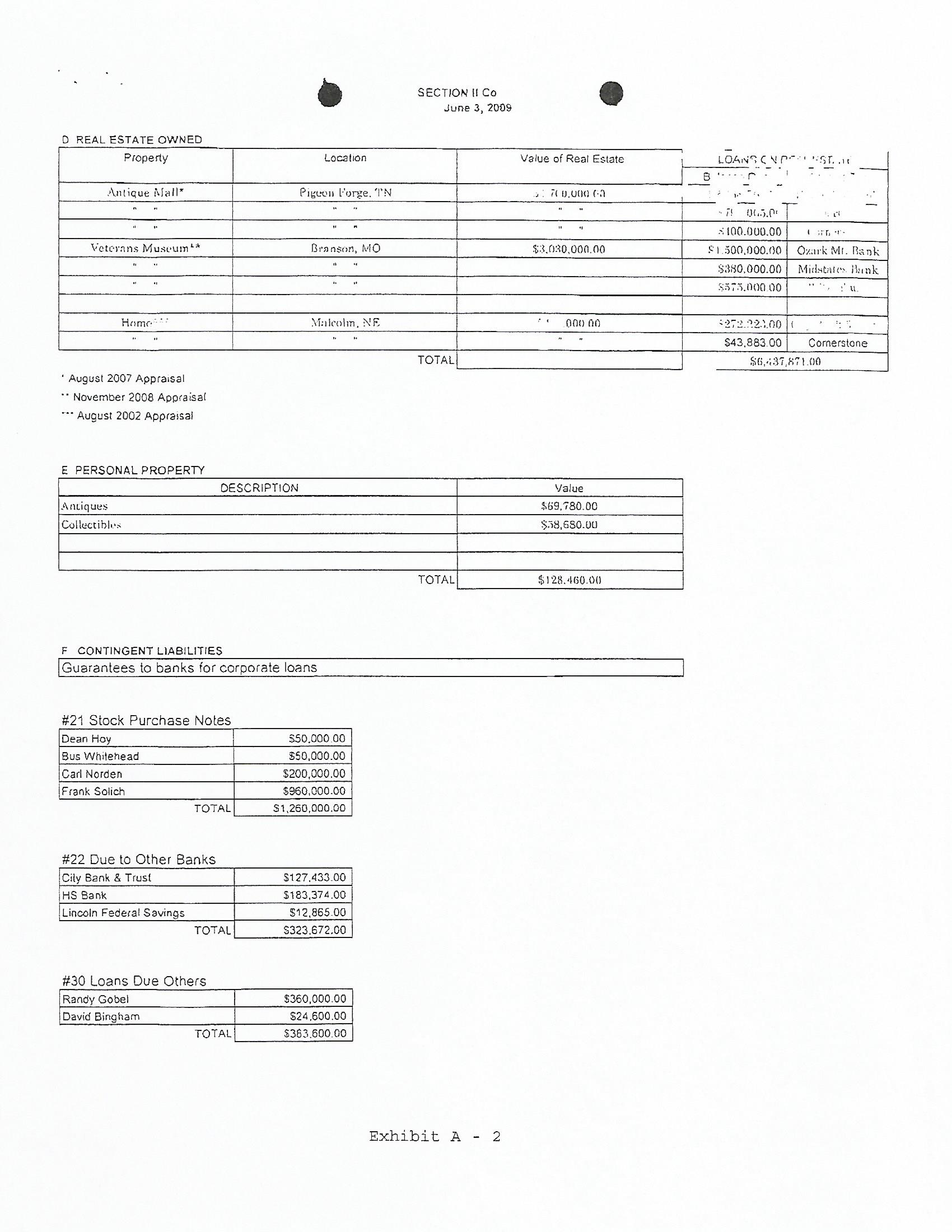 The certificates below were issued, and used for collateral to the bank. The stock certificate for the Veterans Memorial Museum was issued on 10th of June 2009. One week after the loan of June 3rd 2009 was issued using the shares of stock as collateral.