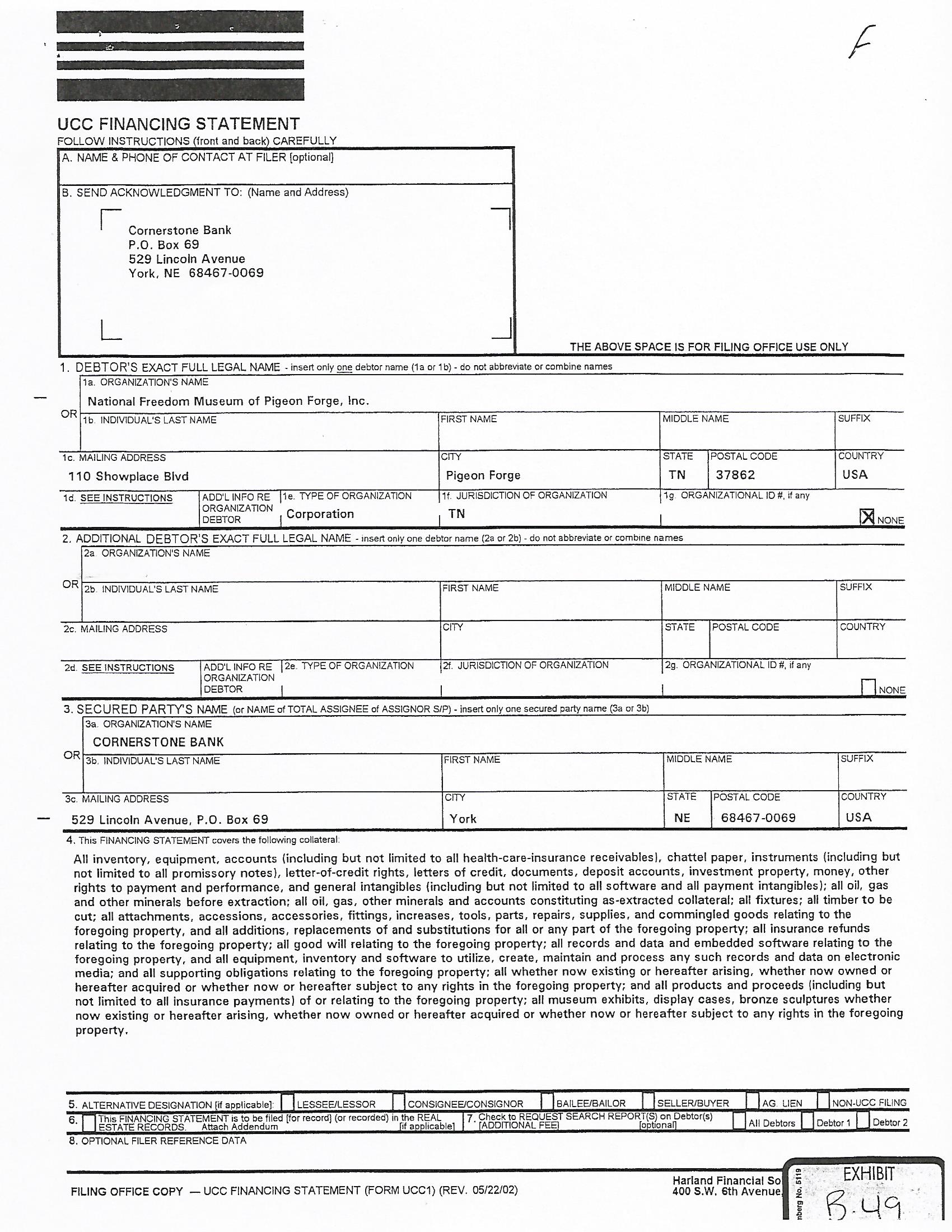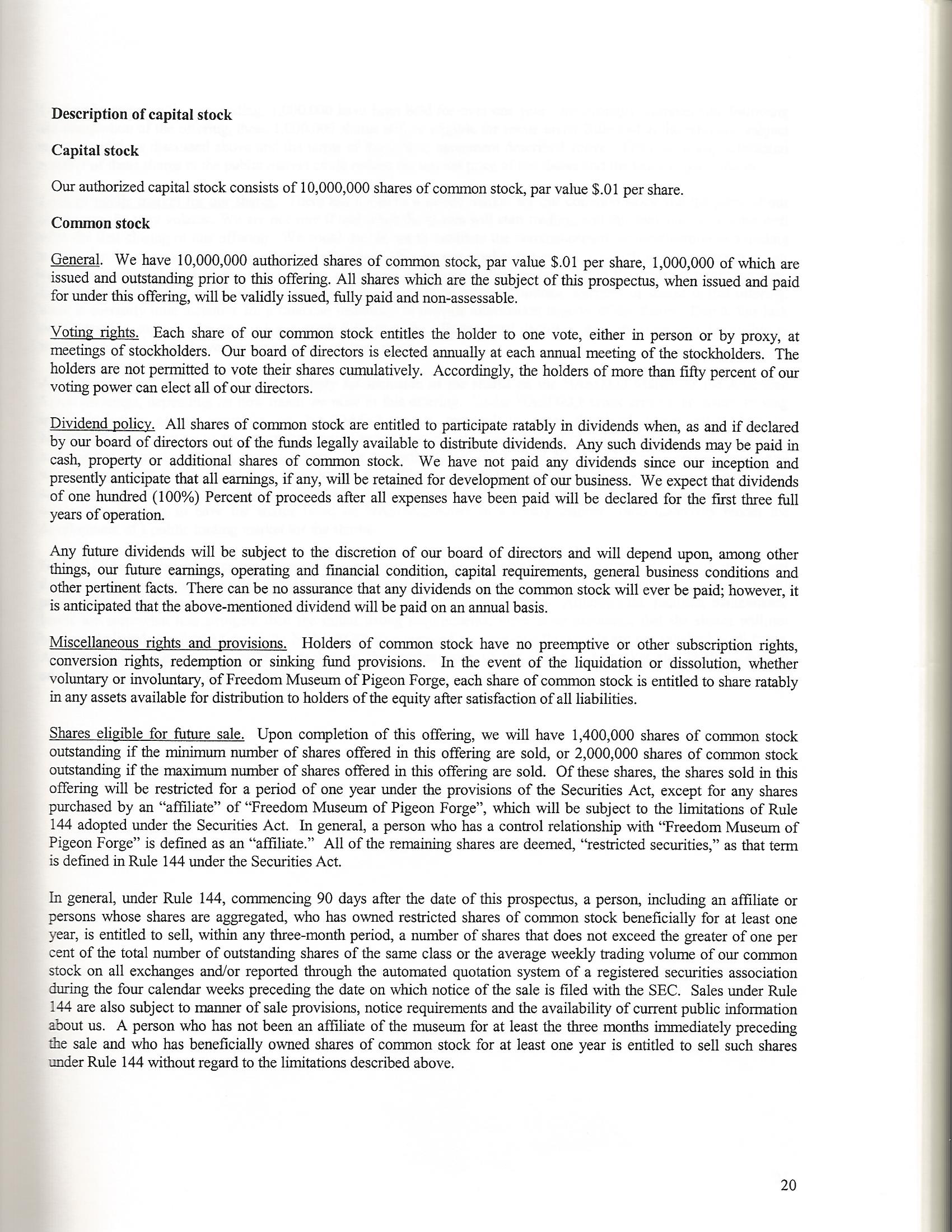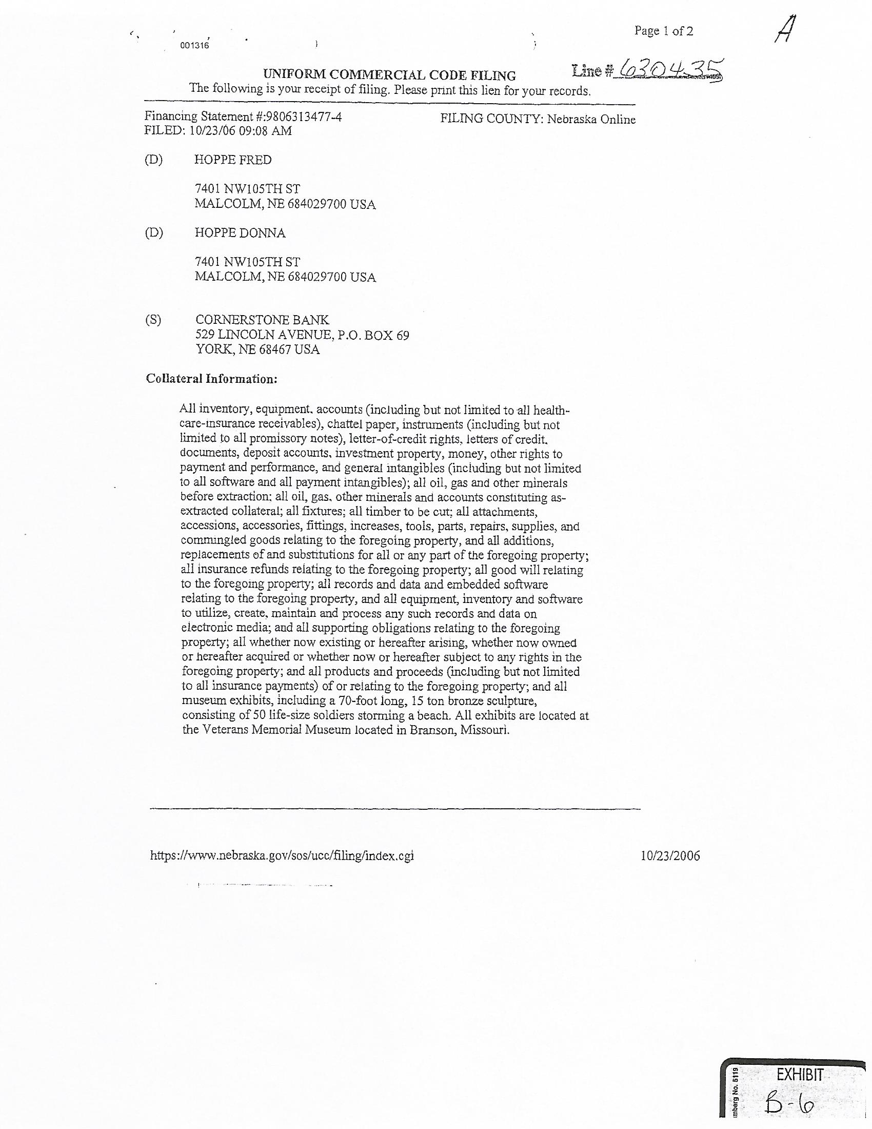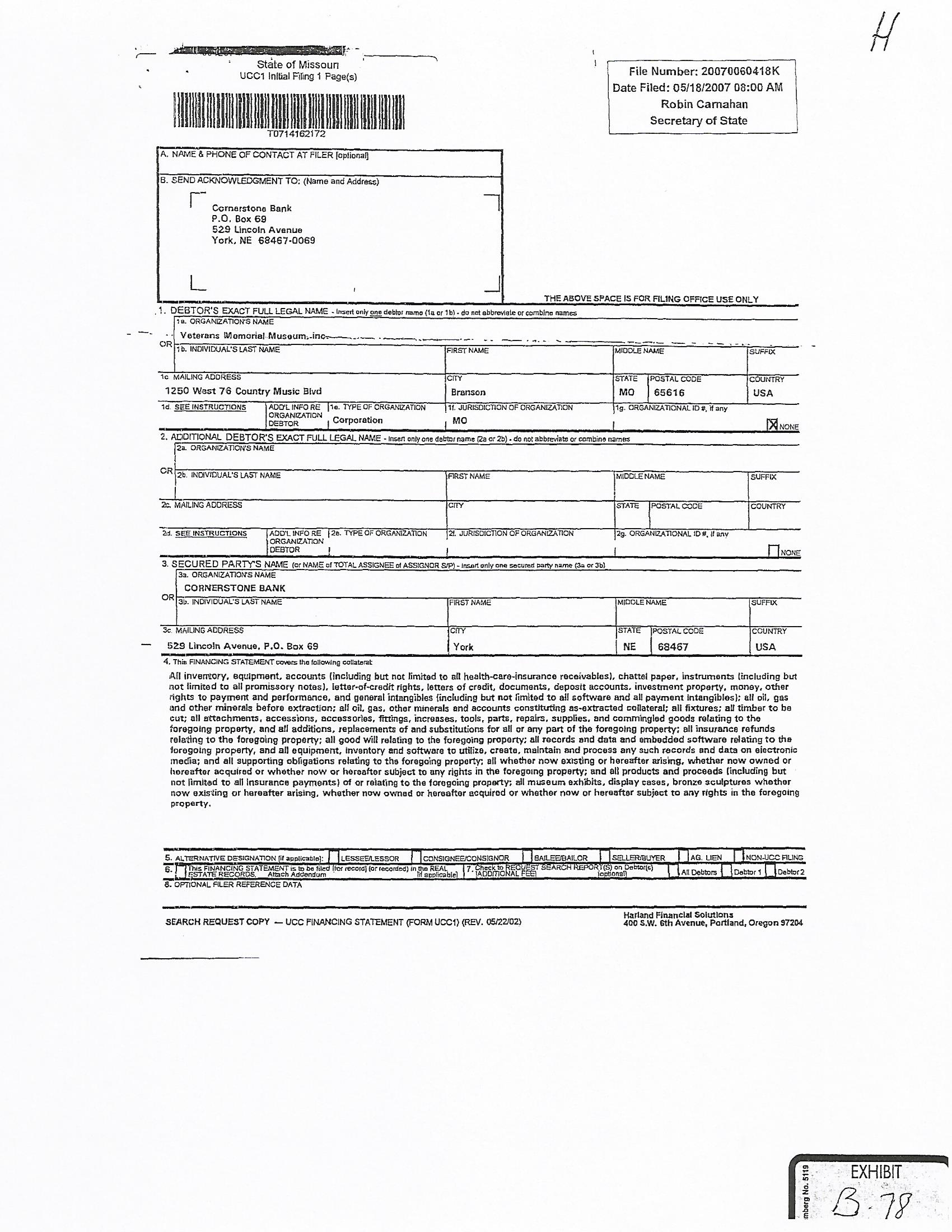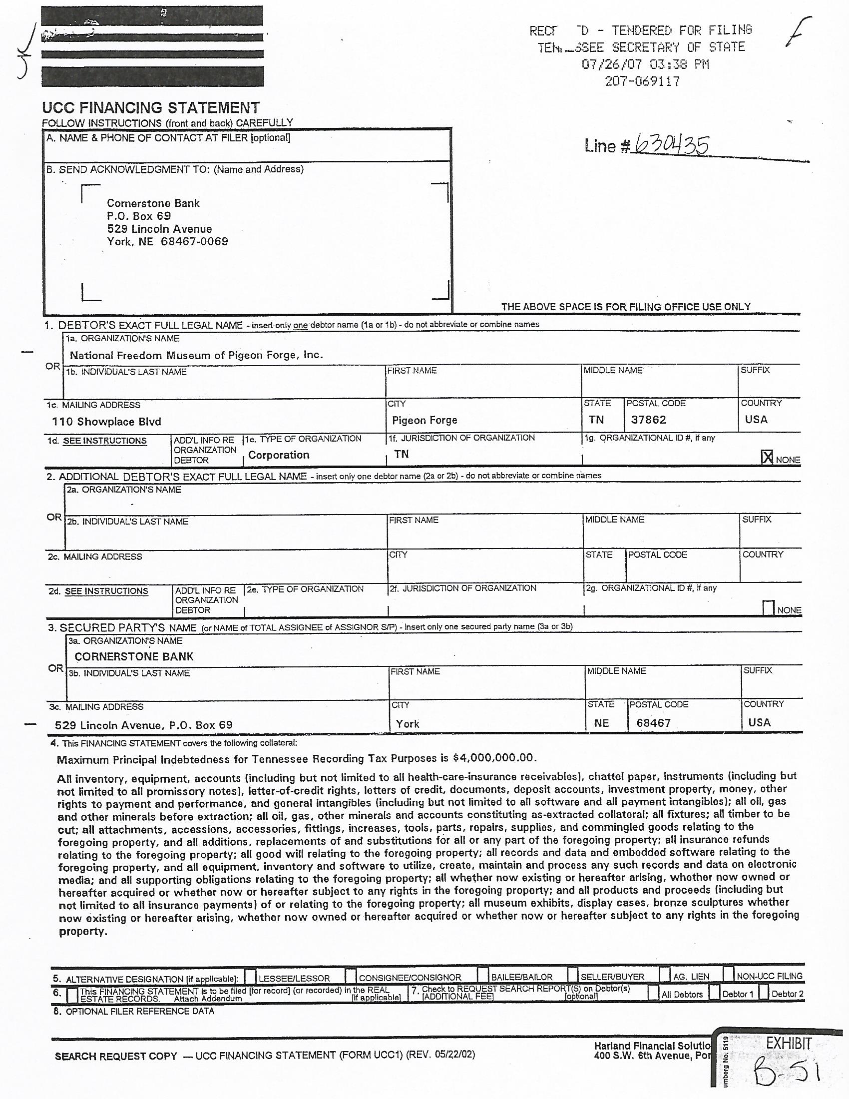 The certificates below were issued, and used for collateral to the bank. The stock certificate for the Veterans Memorial Museum was issued on 10th of June 2009. One week after the loan of June 3rd 2009 was issued using the shares of stock as collateral.